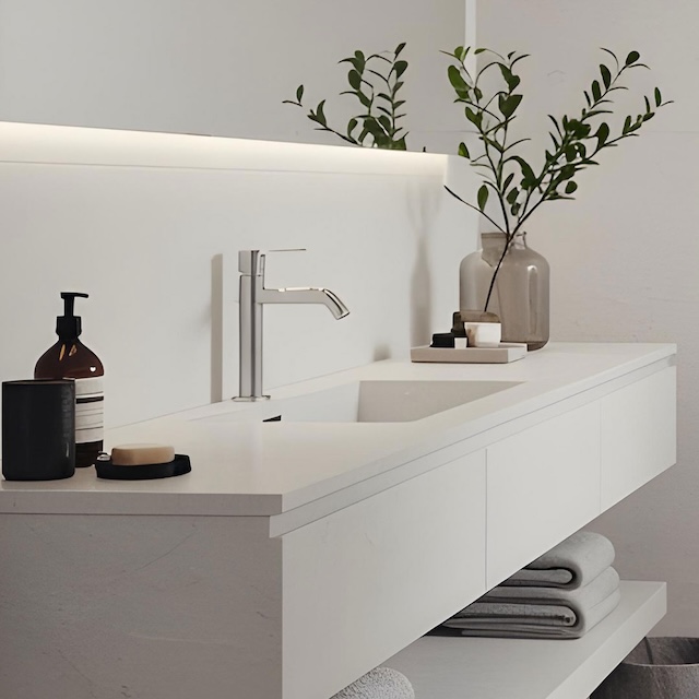 La salle de bain est équipée d’une double vasque, d’une douche, d’une baignoire et de rangements.